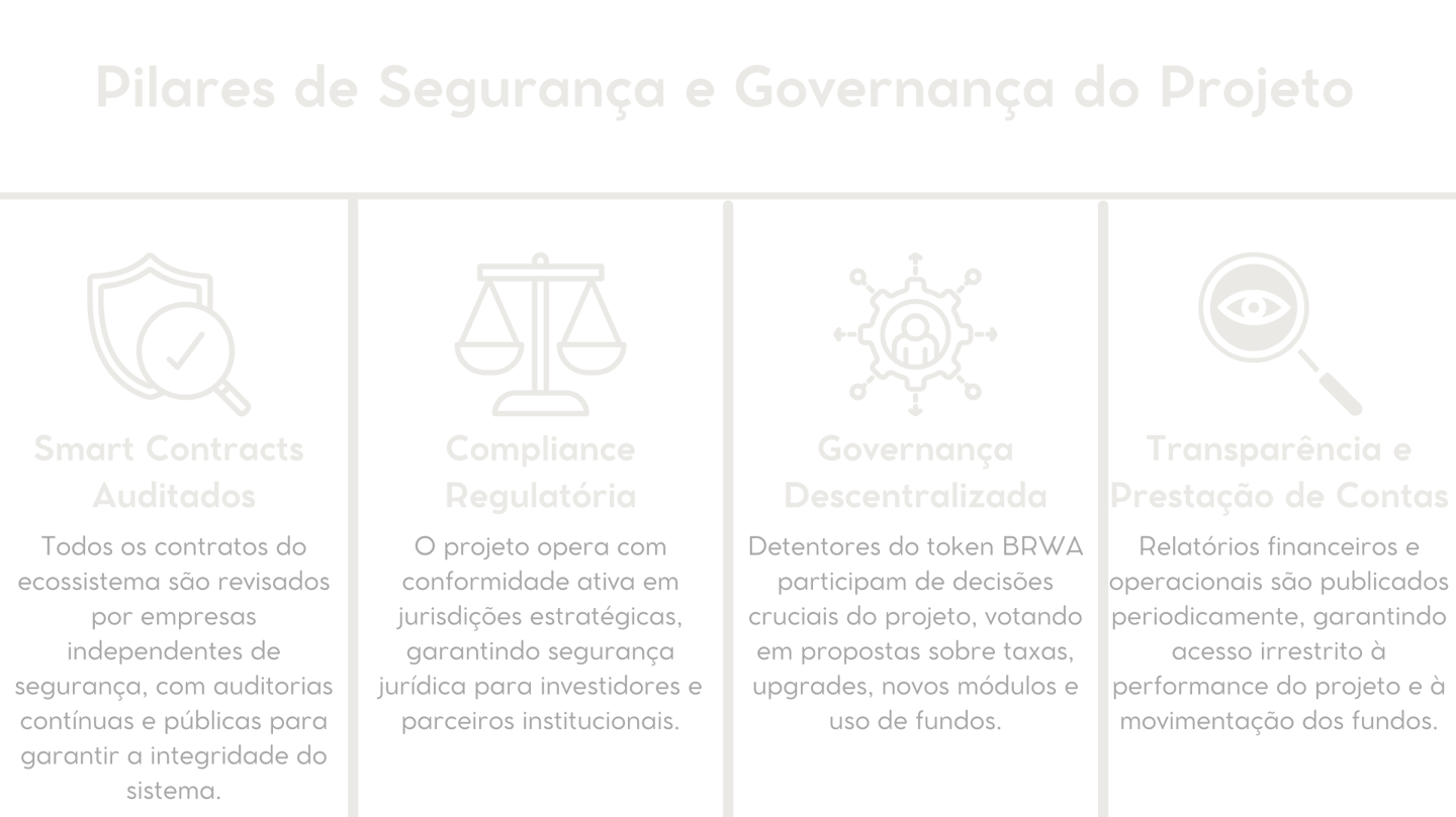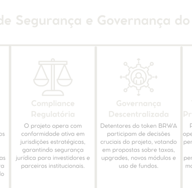 Titulares de BRWA participam ativamente da governança do projeto por meio de uma DAO, votando em atualizações, ajustes de taxas e decisões estratégicas.