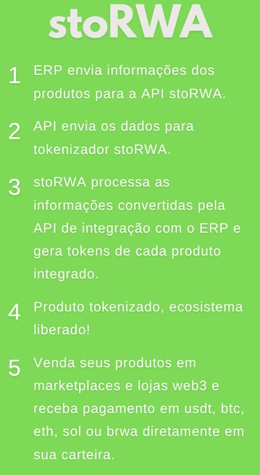 Transforme produtos físicos em tokens digitais integrando seu ERP à nossa API. Venda em marketplaces descentralizados e receba em USDT, BTC, ETH, SOL ou BRWA, diretamente na sua carteira. Elimine intermediários, reduza custos e amplie seu alcance no mercado digital.